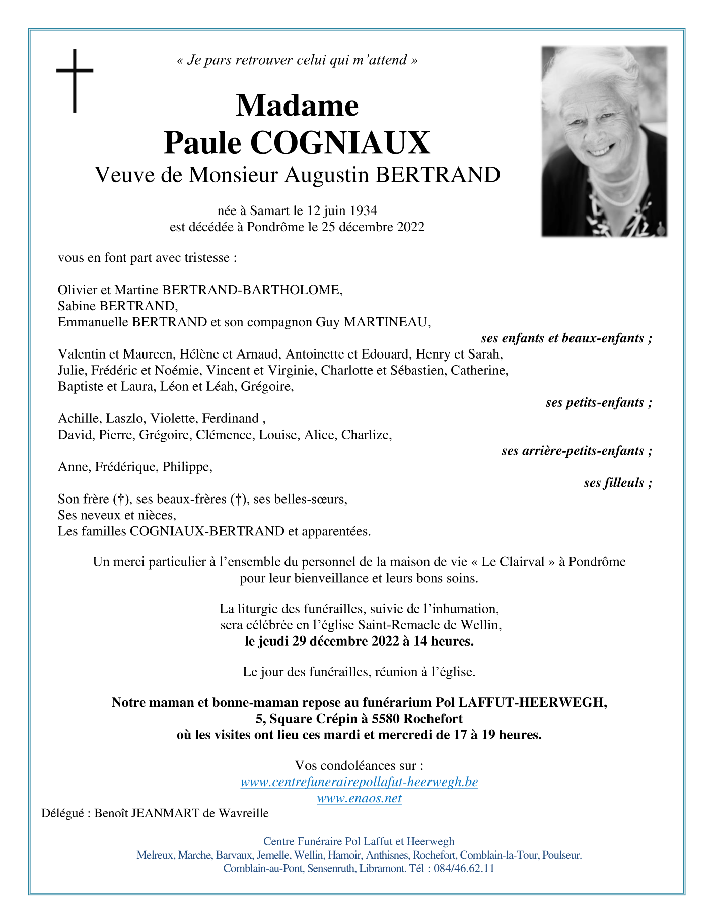 Décédée à Pondrôme (5574) le dimanche 25 décembre 2022 à l'âge de 88 ans
