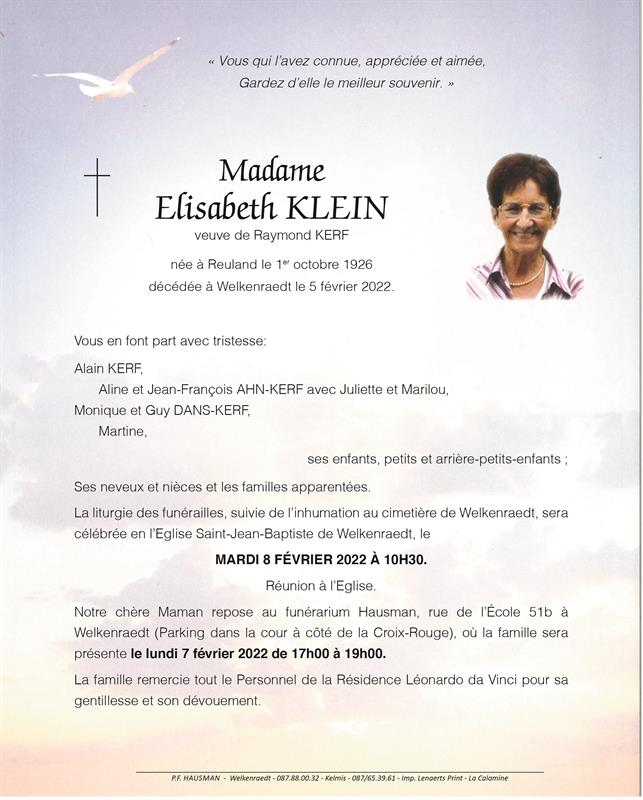 Fallecida en Welkenraedt (4840) el sábado, 5 de febrero de 2022 a la edad de 95 años