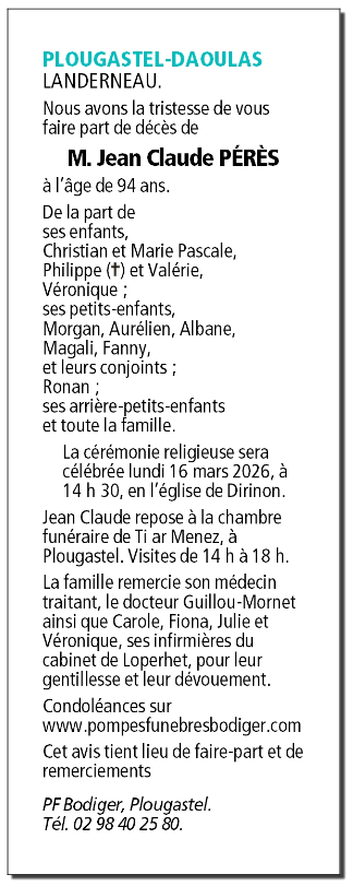 Fallecido en Bohars (29820, Francia) el jueves, 12 de marzo de 2026 a la edad de 94 años