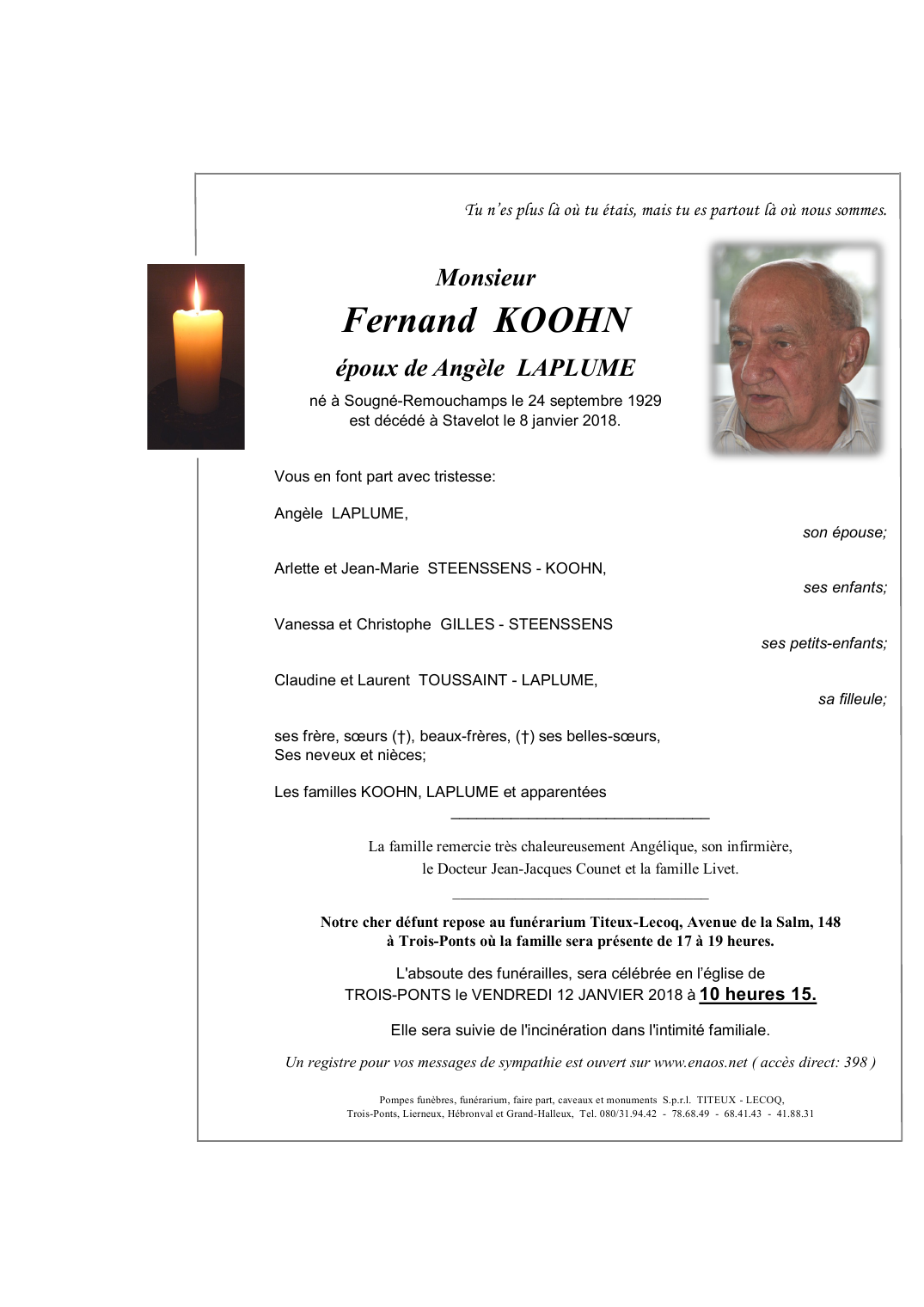 Décédé à Stavelot (4970) le lundi 8 janvier 2018 à l'âge de 88 ans