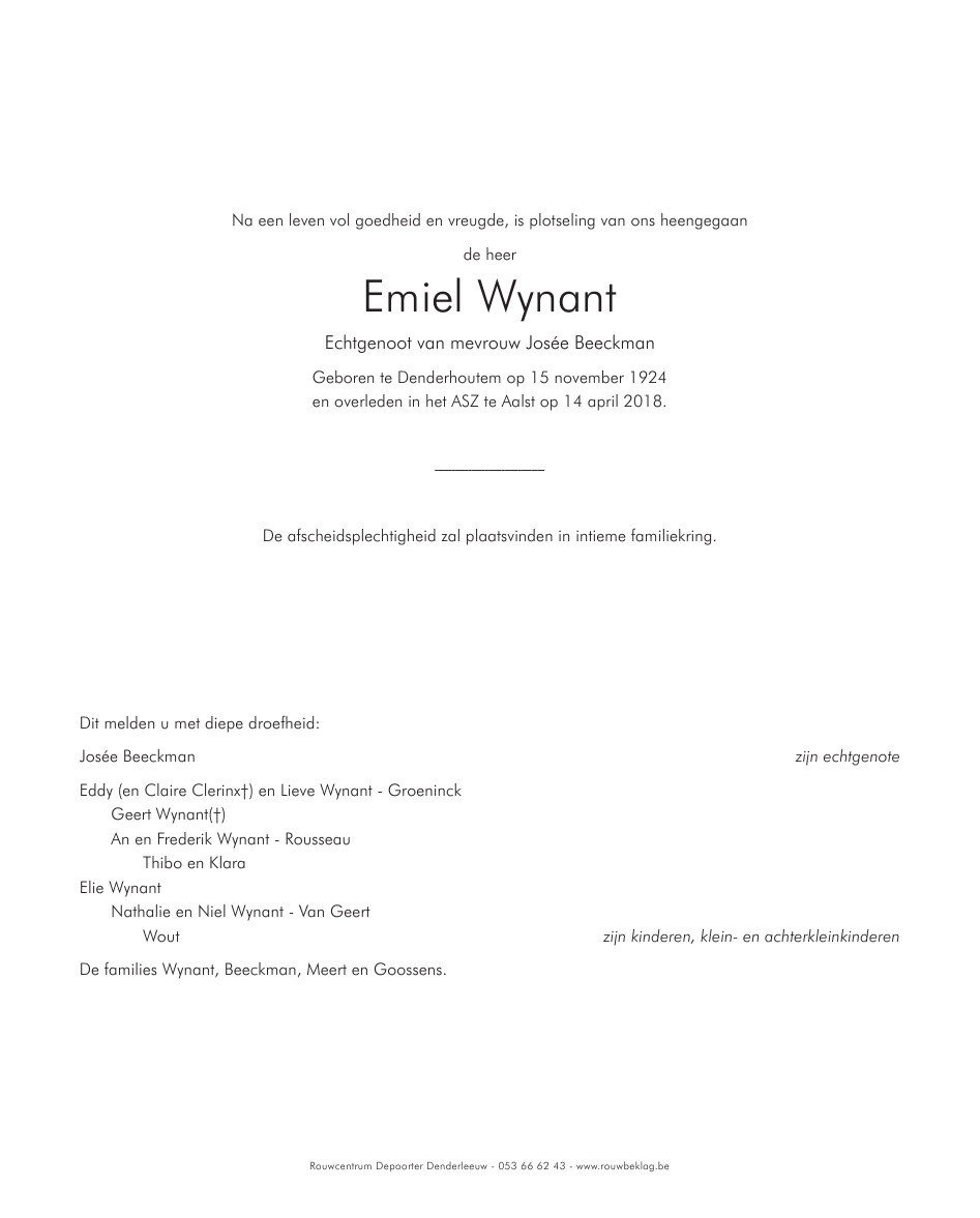 Died in Aalst (9300) on 14 April 2018 at the age of 93 years