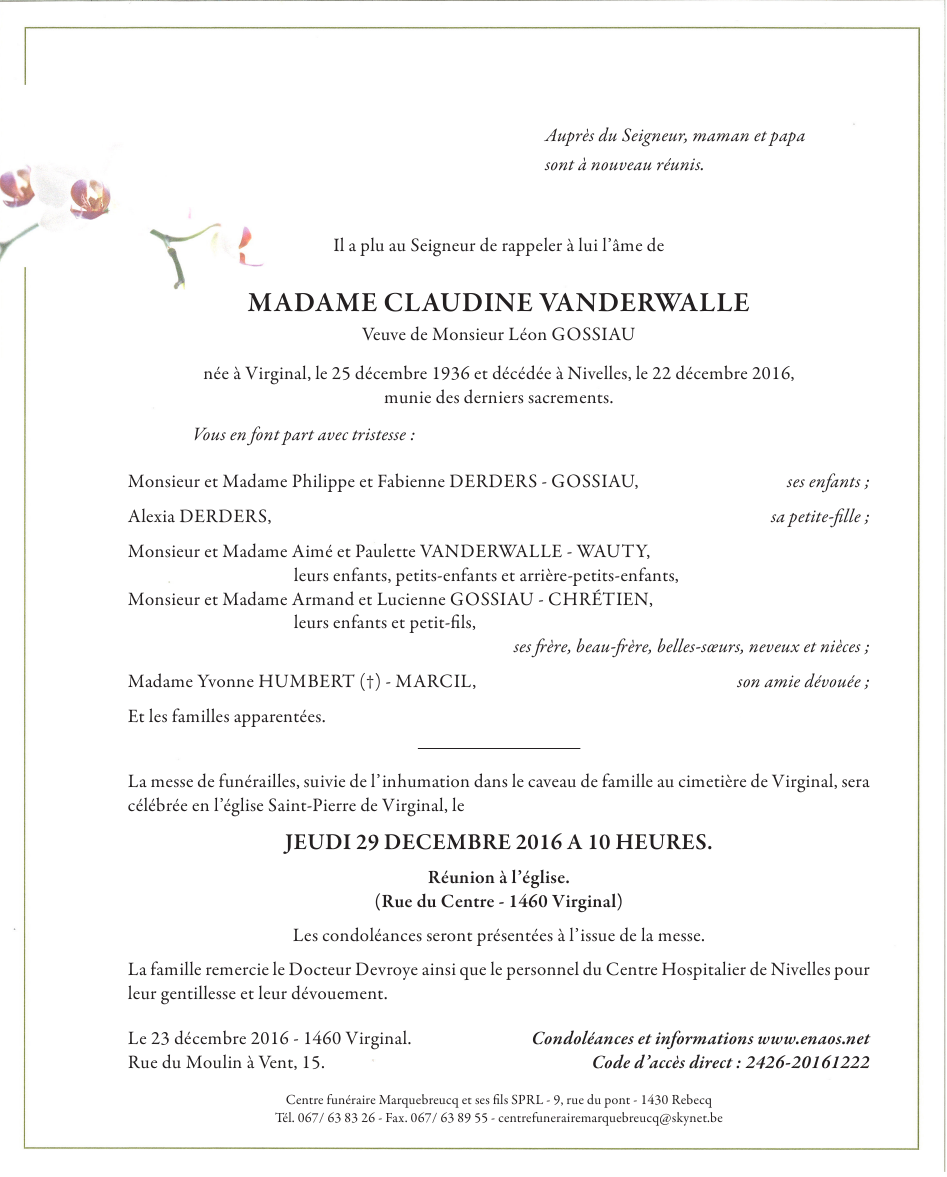 Overleden te Nivelles (1400) op donderdag 22 december 2016 op 79-jarige leeftijd