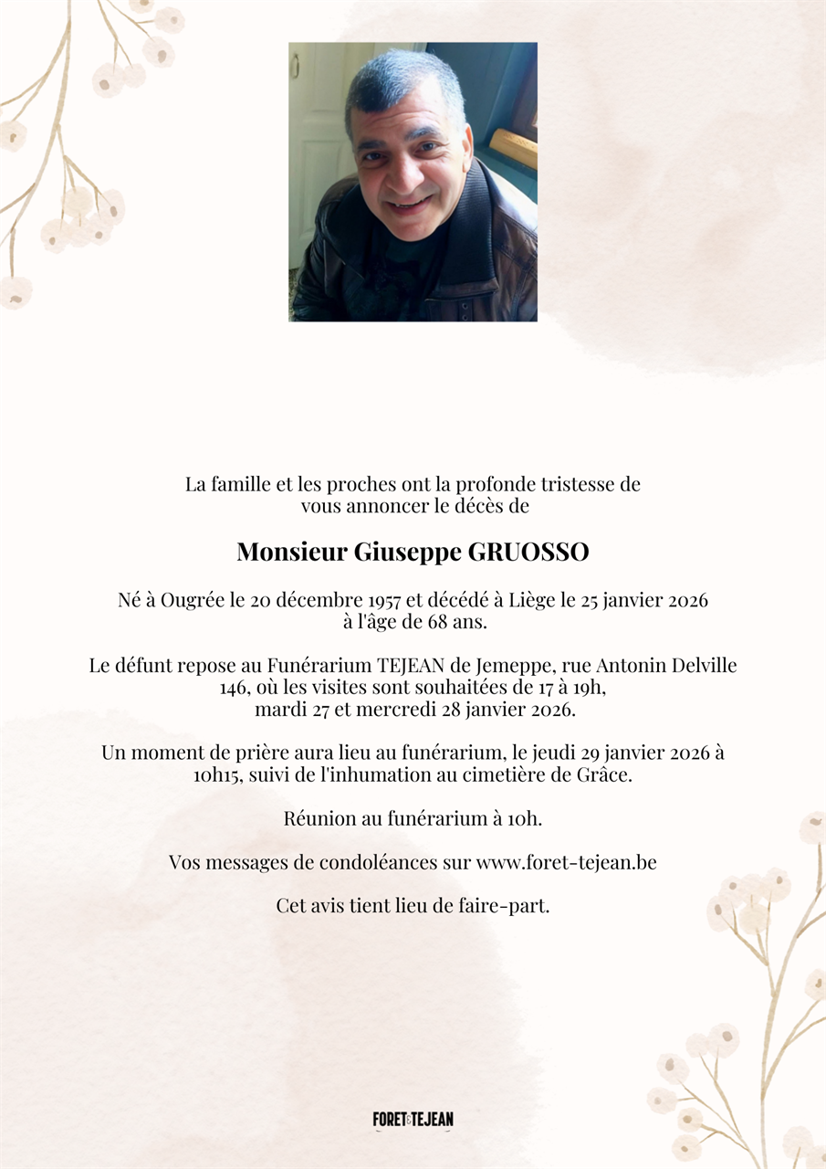 Décédé à Liège (4000) le dimanche 25 janvier 2026 à l'âge de 68 ans