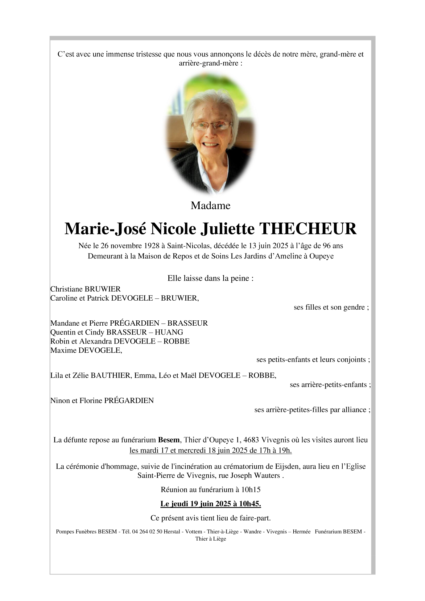 Décédée à Oupeye (4680) le vendredi 13 juin 2025 à l'âge de 96 ans