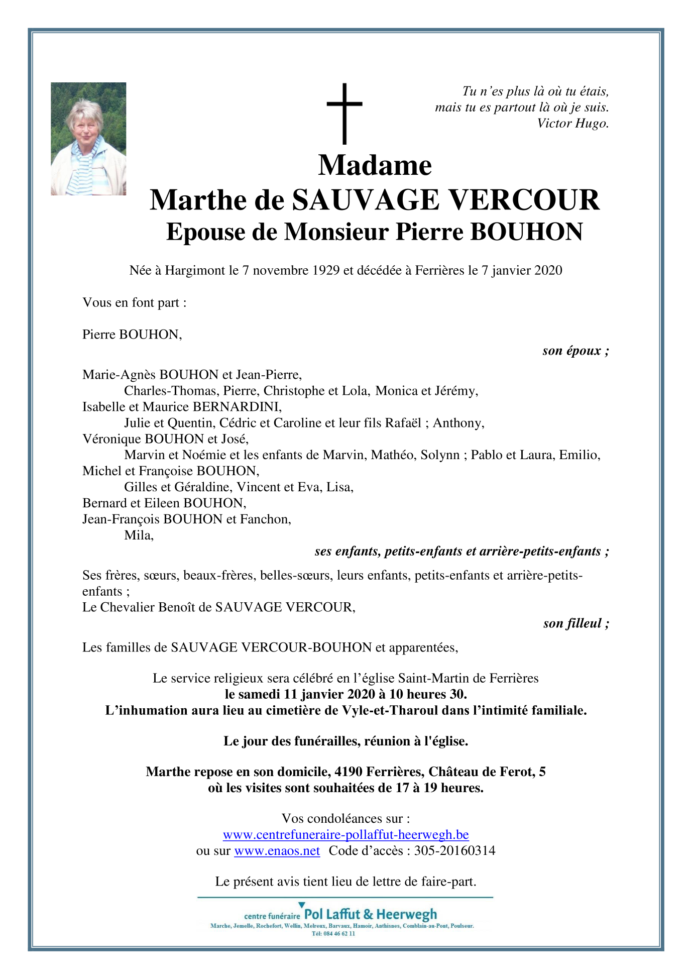 Fallecida en Ferrières (4190) el martes, 7 de enero de 2020 a la edad de 90 años