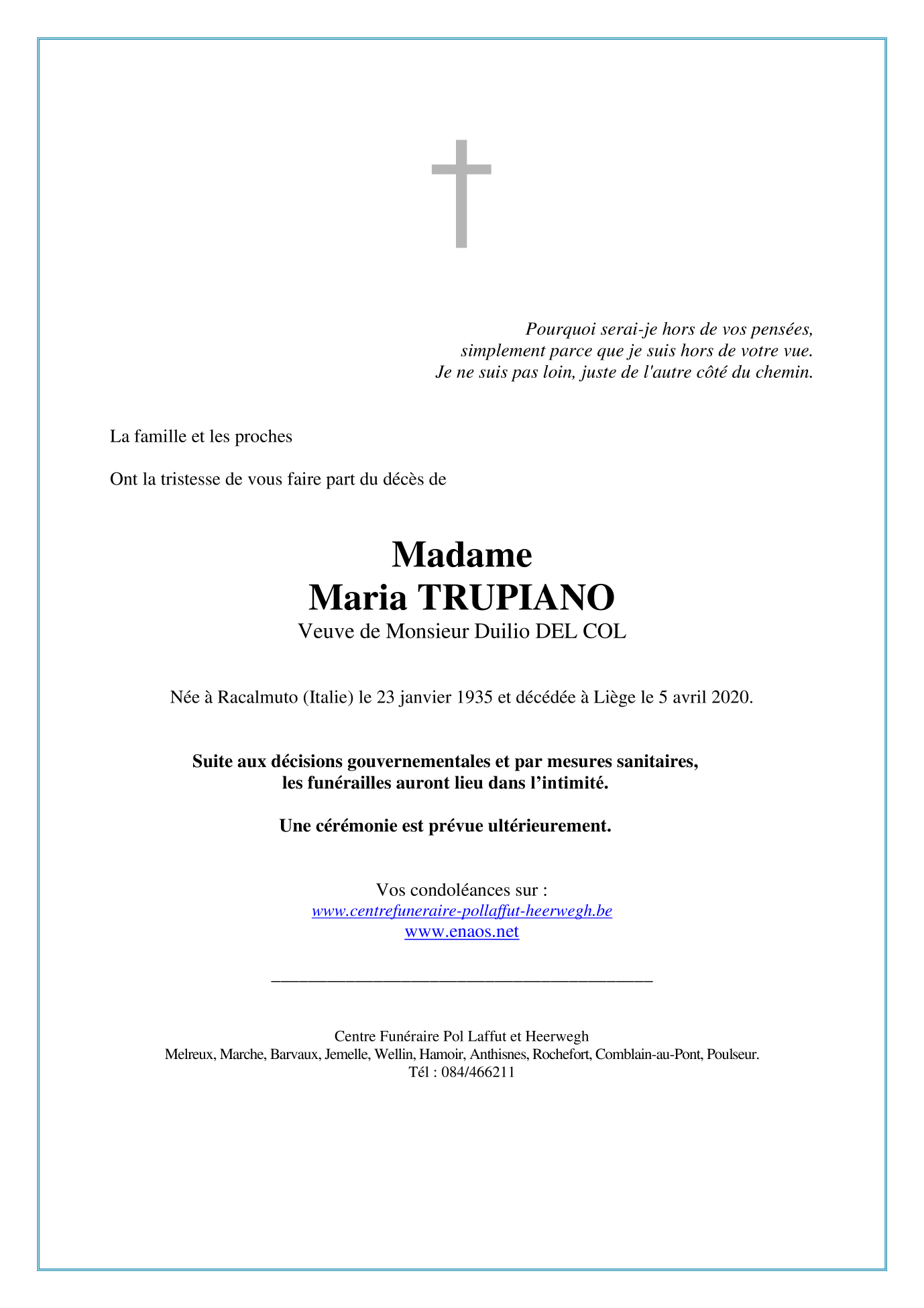 Fallecida en Liège (4000) el domingo, 5 de abril de 2020 a la edad de 85 años