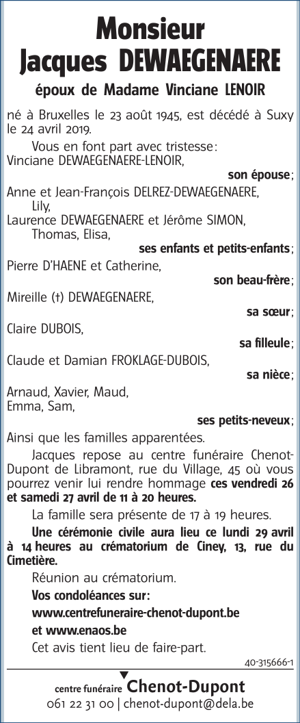 Décédé à Suxy (6812) le mercredi 24 avril 2019 à l'âge de 73 ans
