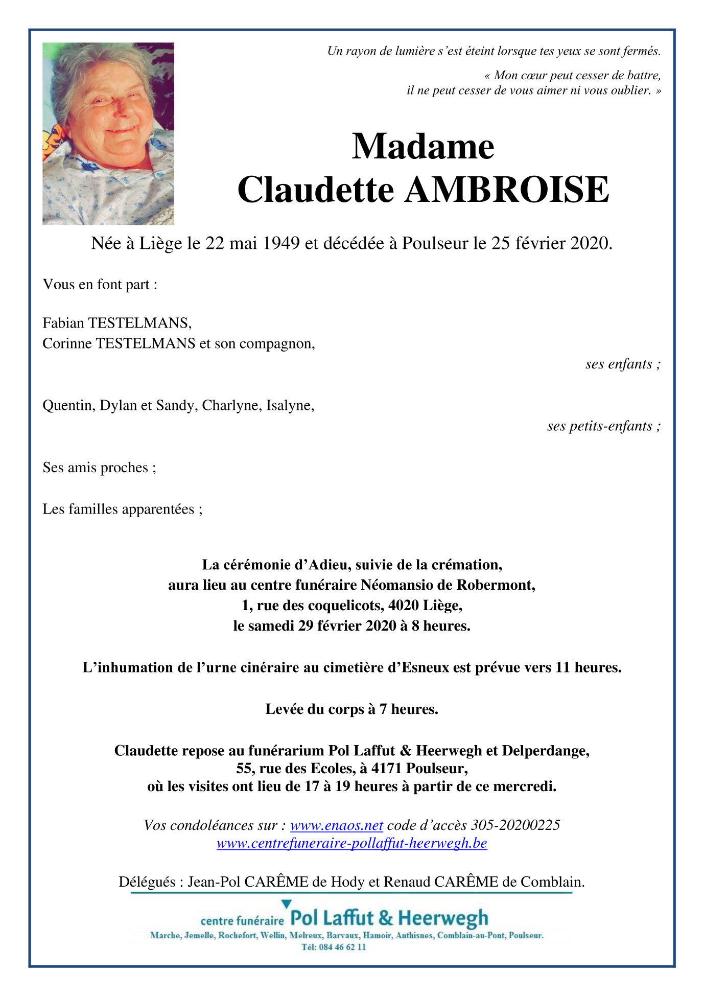Overleden te Poulseur (4171) op dinsdag 25 februari 2020 op 70-jarige leeftijd