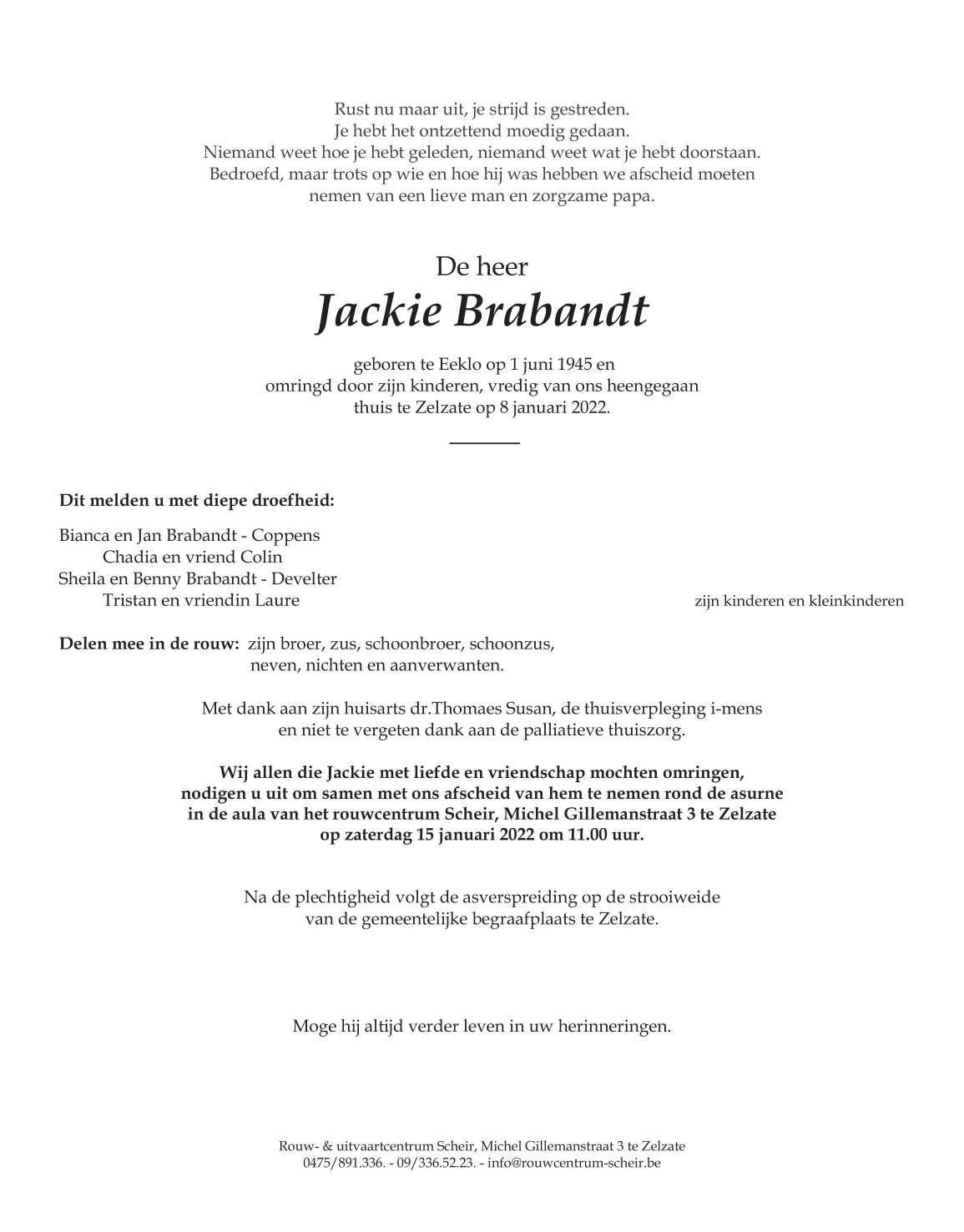 Overleden te Zelzate (9060) op zaterdag 8 januari 2022 op 76-jarige leeftijd
