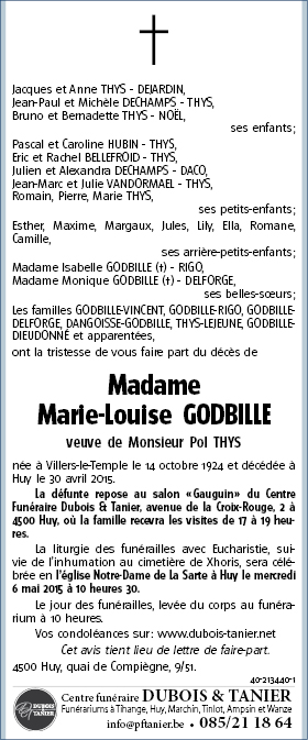 Décédée à Huy (4500) le jeudi 30 avril 2015 à l'âge de 90 ans