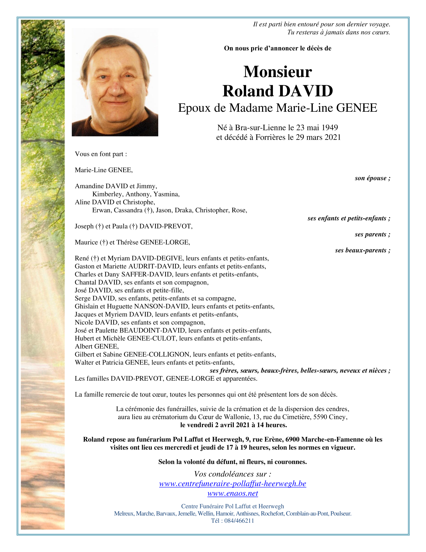 Died in Forrières (6953) on 29 March 2021 at the age of 71 years