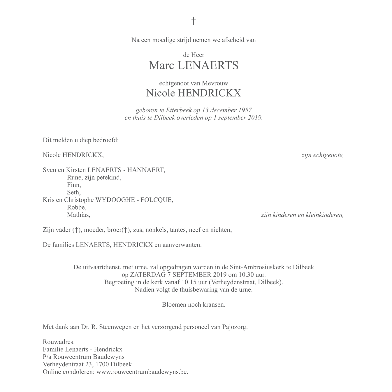 Fallecido en Dilbeek (1700) el domingo, 1 de septiembre de 2019 a la edad de 61 años