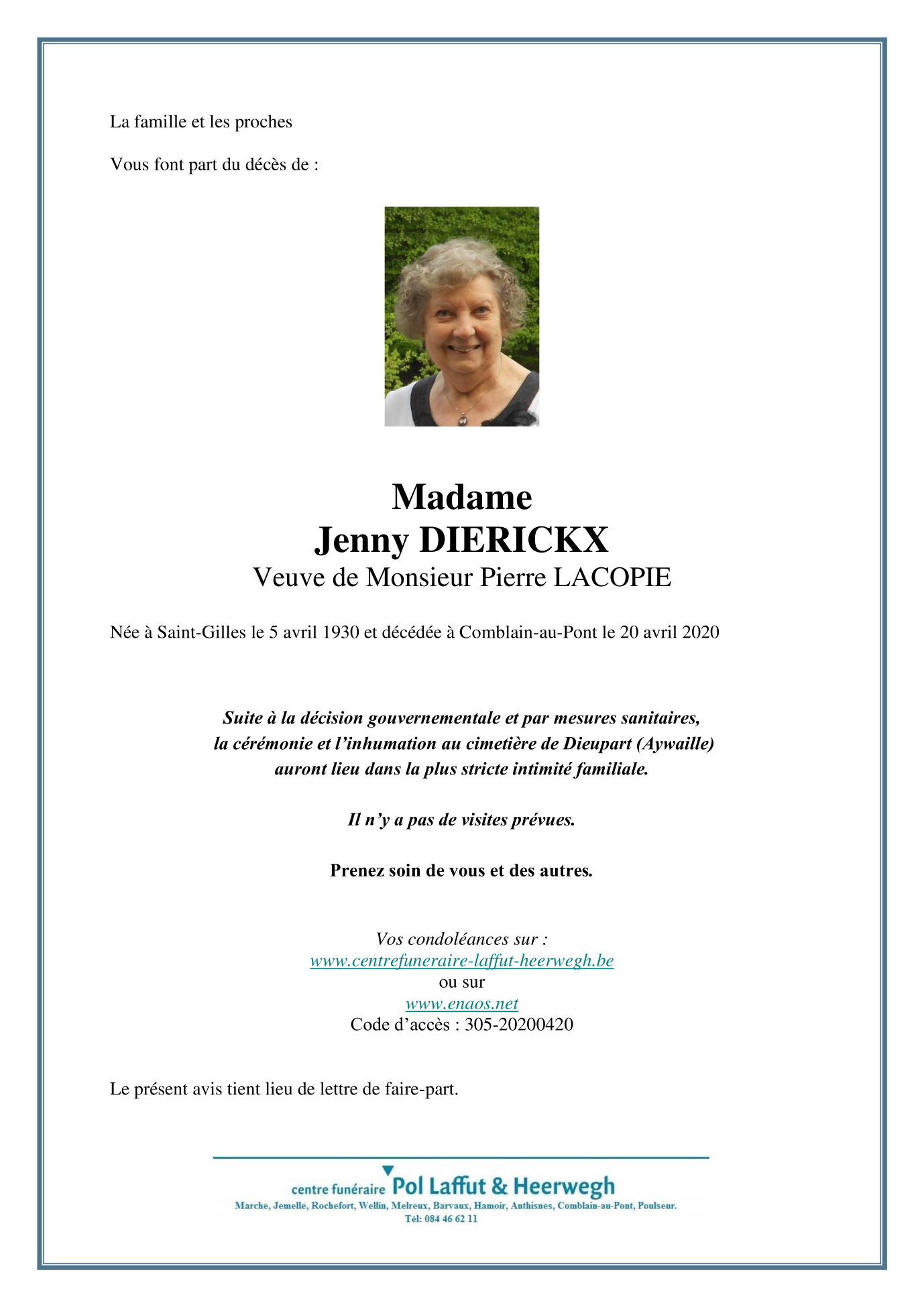 Died in Comblain-au-Pont (4170) on 20 April 2020 at the age of 90 years