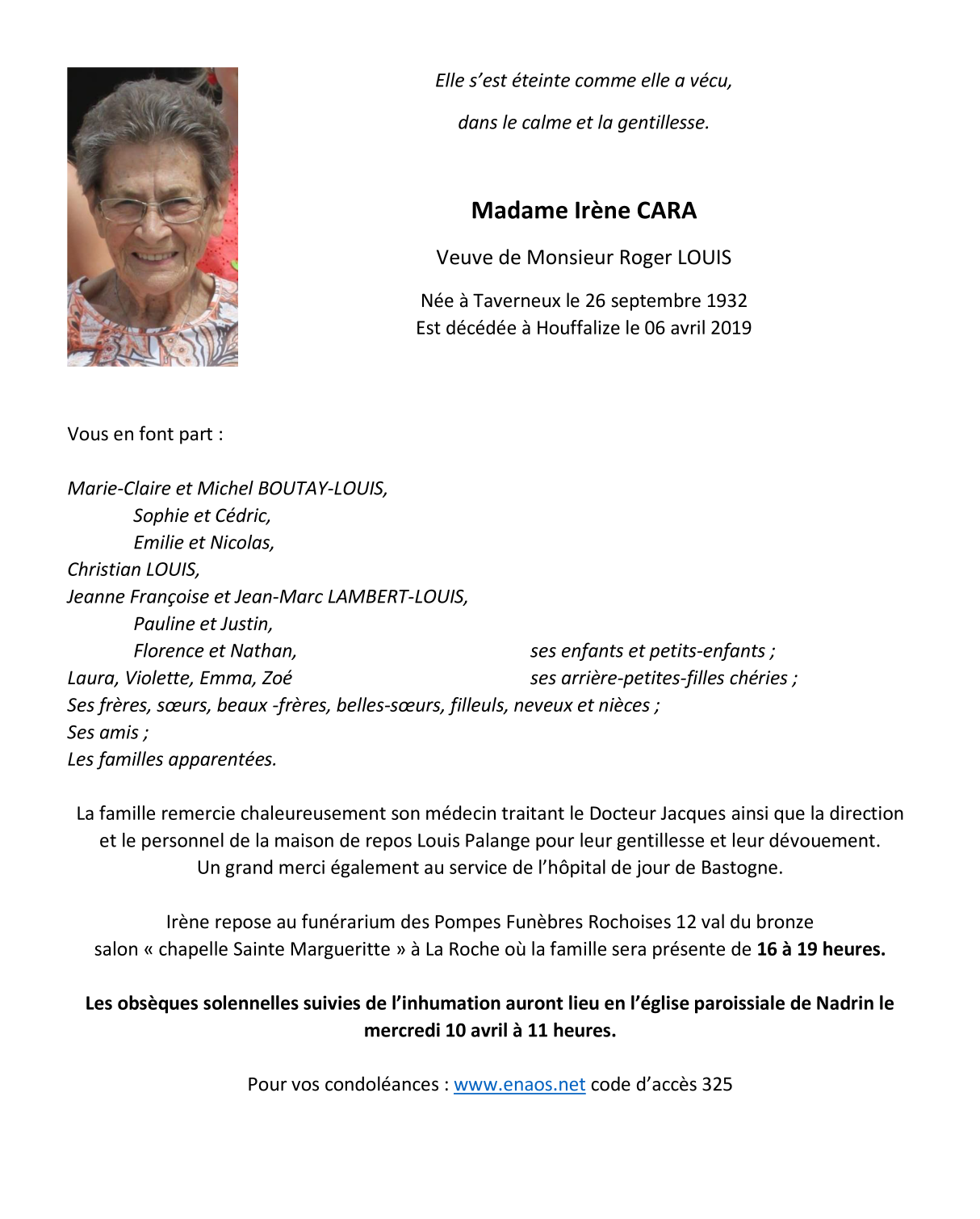 Fallecida en Houffalize (6660) el sábado, 6 de abril de 2019 a la edad de 86 años