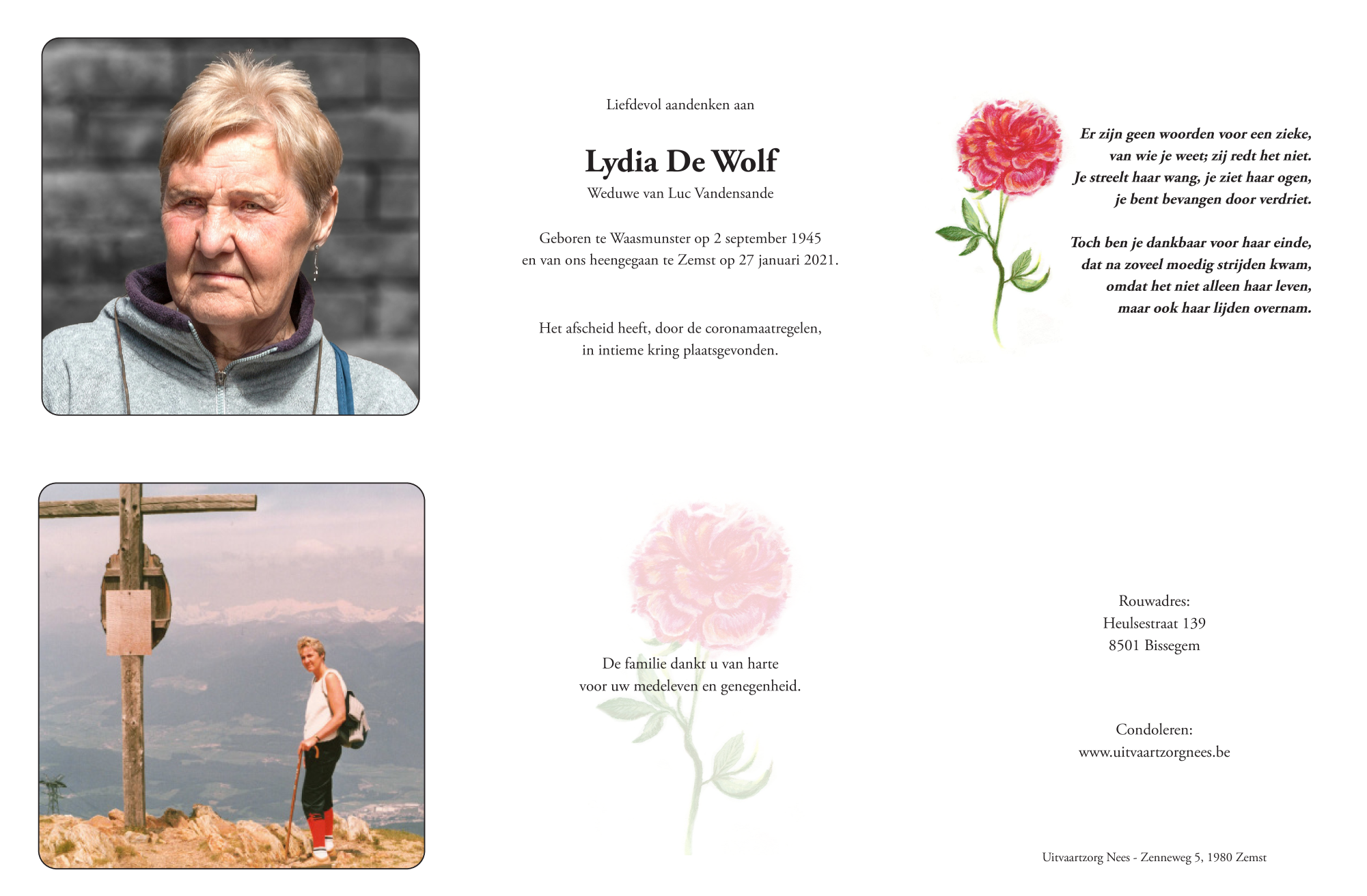 Décédée à Zemst (1980) le mercredi 27 janvier 2021 à l'âge de 75 ans