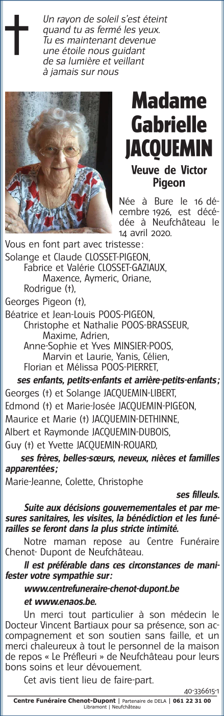 Décédée à Neufchâteau (6840) le mardi 14 avril 2020 à l'âge de 93 ans