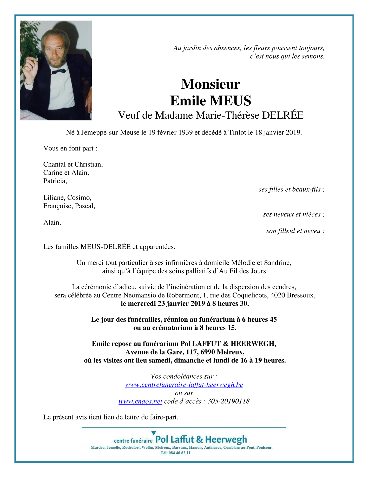 Décédé à Tinlot (4557) le vendredi 18 janvier 2019 à l'âge de 79 ans