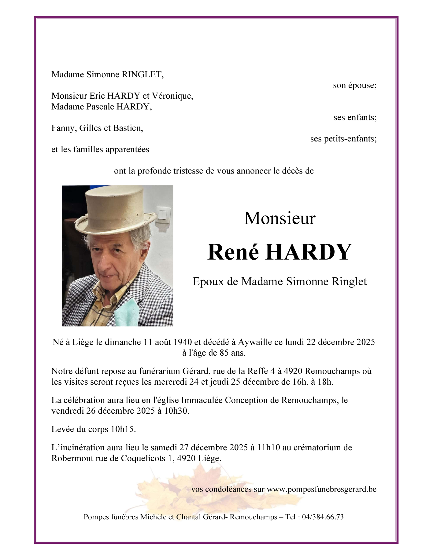 Décédé à Aywaille (4920) le lundi 22 décembre 2025 à l'âge de 85 ans