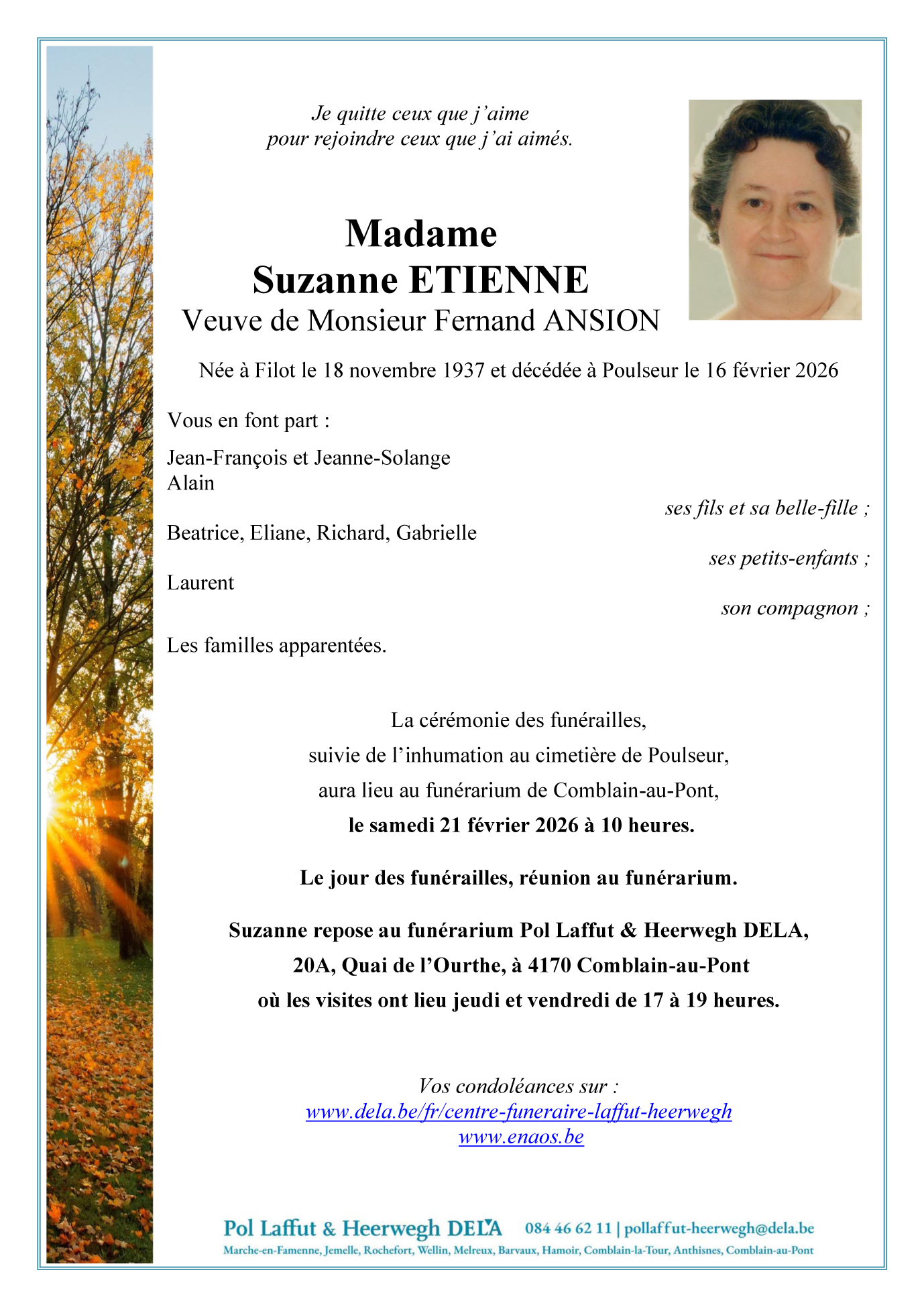 Died in Poulseur (4171) on 16 February 2026 at the age of 88 years