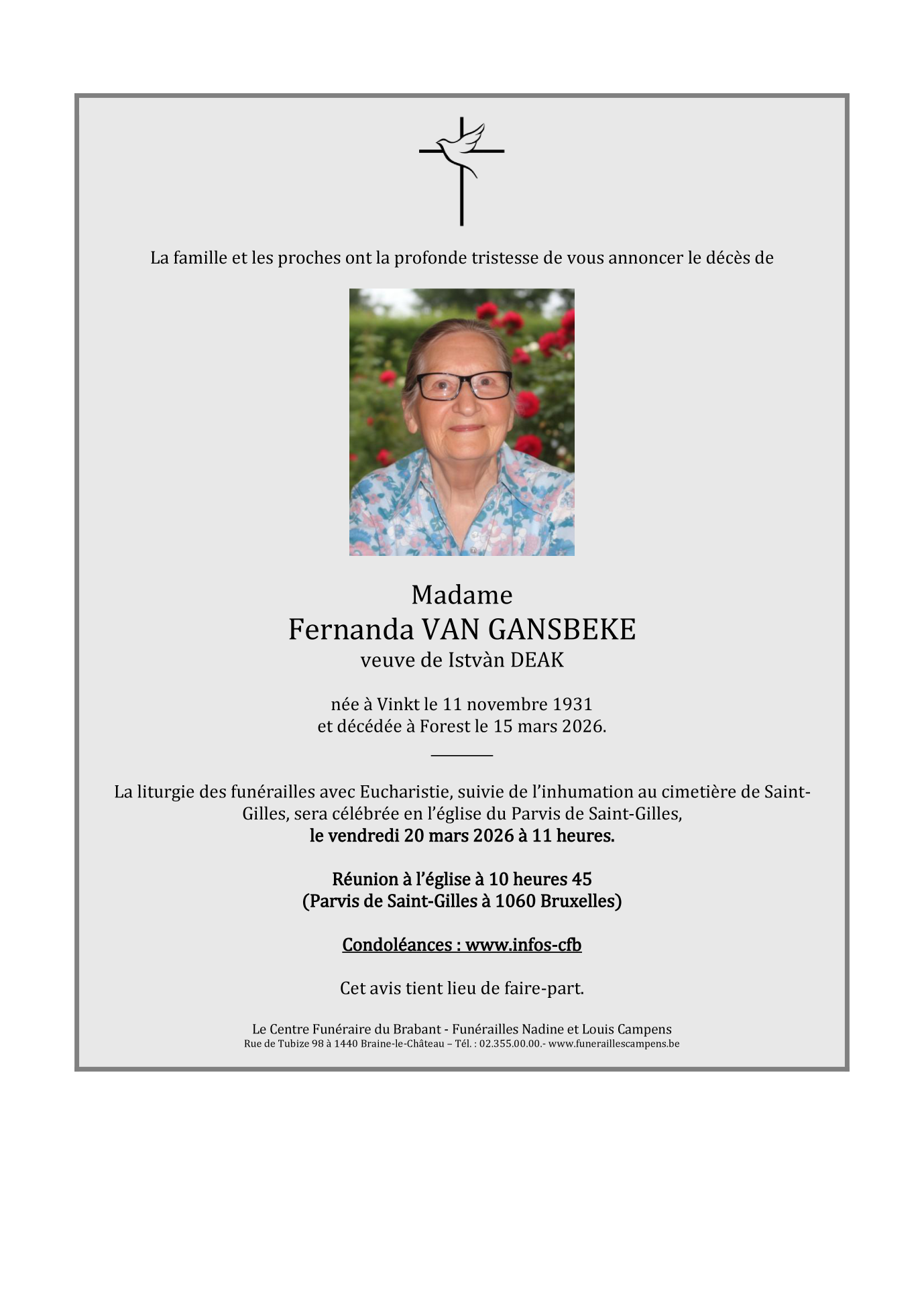 Décédée à Forest (1190) le dimanche 15 mars 2026 à l'âge de 94 ans