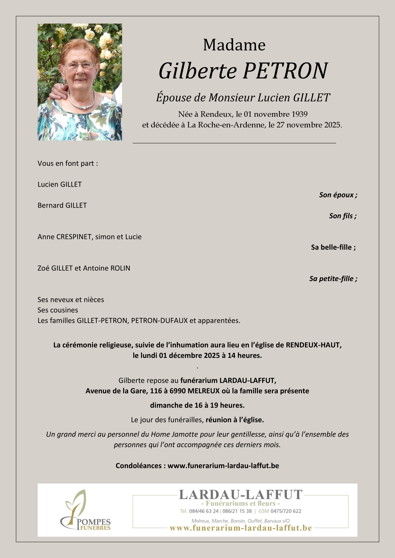Décédée à La Roche-en-Ardenne (6980) le jeudi 27 novembre 2025 à l'âge de 86 ans