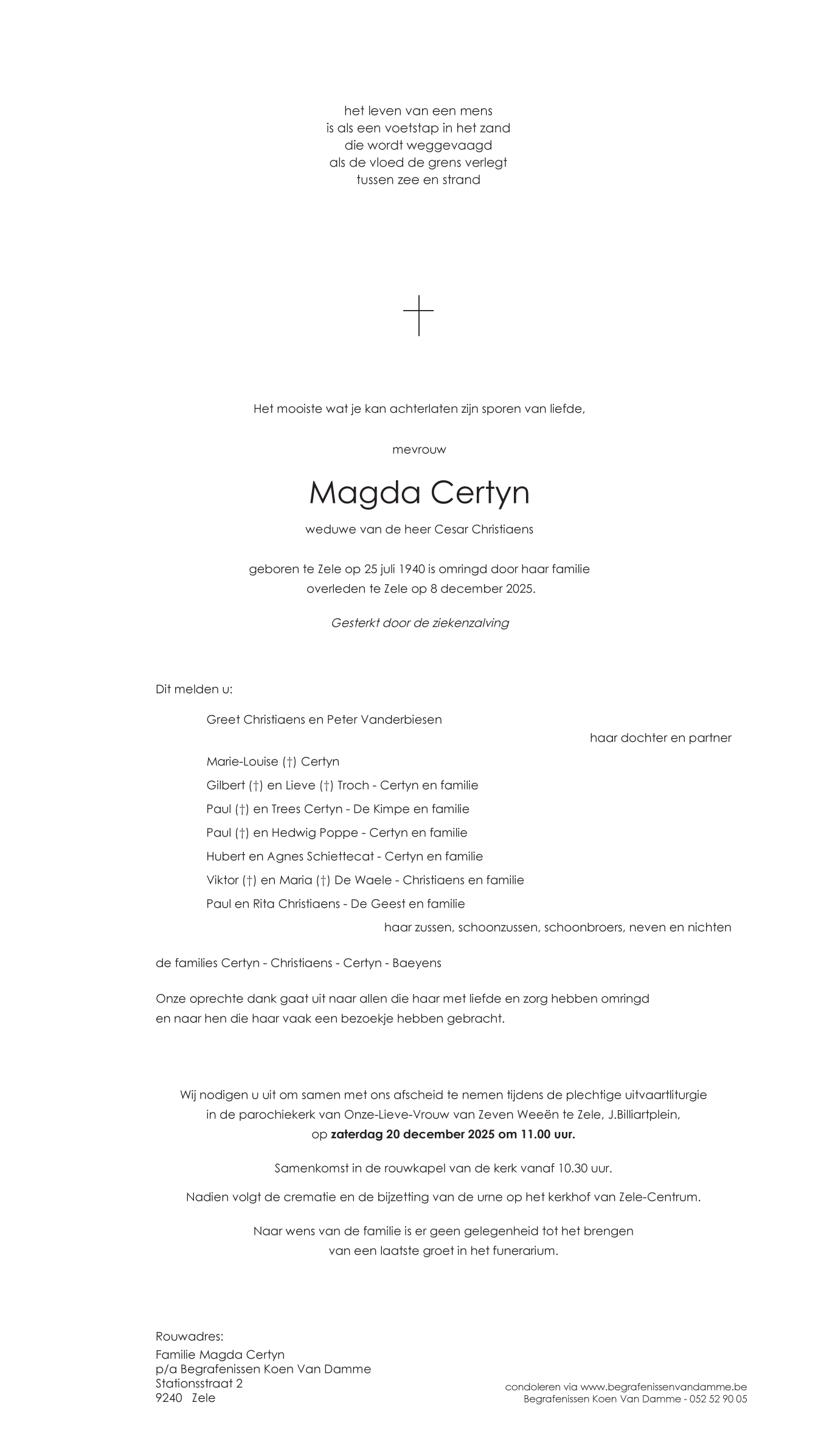 Décédée à Zele (9240) le lundi 8 décembre 2025 à l'âge de 85 ans