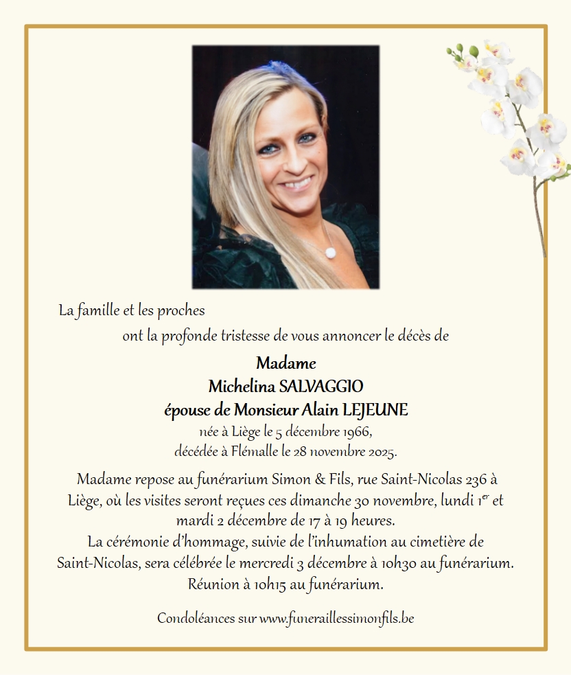 Fallecida en Flémalle (4400) el viernes, 28 de noviembre de 2025 a la edad de 58 años