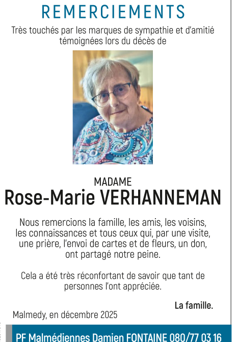 Décédée à Verviers (4800) le vendredi 12 décembre 2025 à l'âge de 75 ans