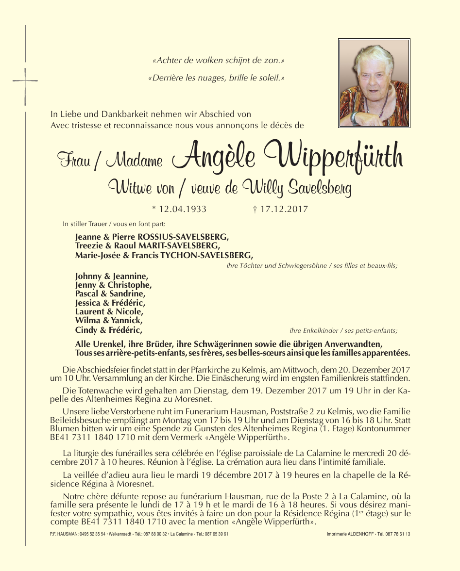 Fallecida en Moresnet (4850) el domingo, 17 de diciembre de 2017 a la edad de 84 años