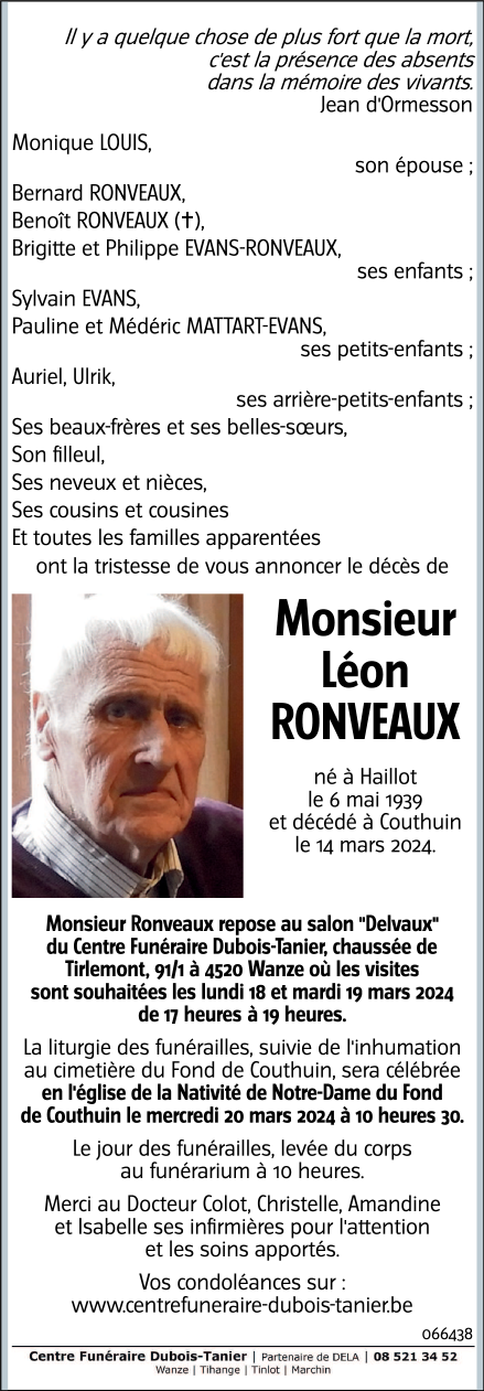 Décédé à Couthuin (4218) le jeudi 14 mars 2024 à l'âge de 84 ans