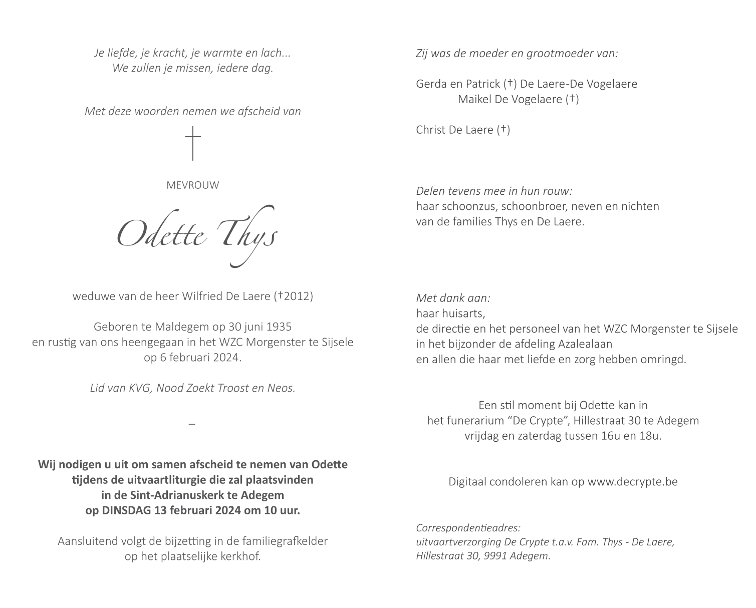 Fallecida en Sijsele (8340) el martes, 6 de febrero de 2024 a la edad de 88 años