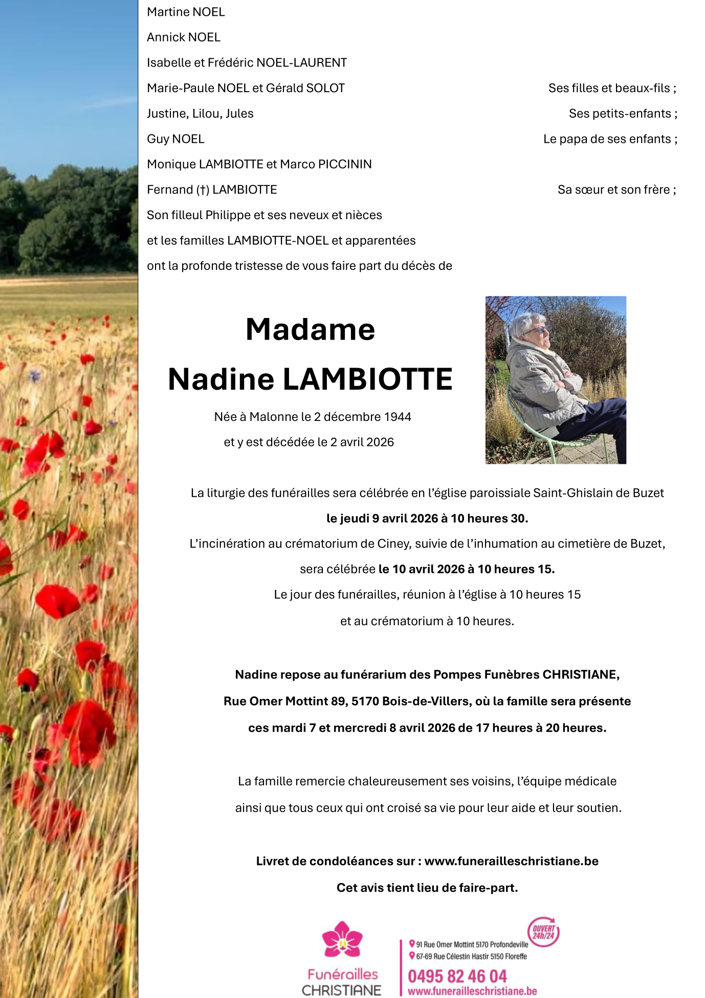 Décédée à Malonne (5020) le jeudi 2 avril 2026 à l'âge de 81 ans