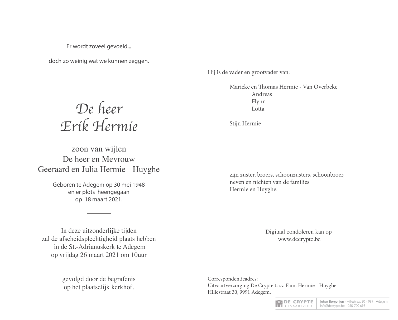 Died in Adegem (9991) on 18 March 2021 at the age of 72 years