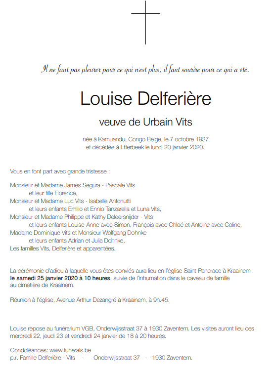 Overleden te Etterbeek (1040) op maandag 20 januari 2020 op 82-jarige leeftijd