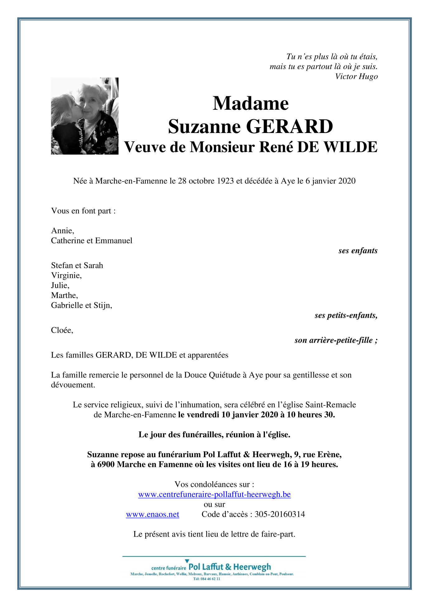 Overleden te Aye (6900) op maandag 6 januari 2020 op 96-jarige leeftijd