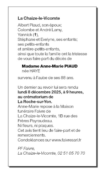 Décédée à La Chaize-le-Vicomte (85310, France) le jeudi 4 décembre 2025 à l'âge de 87 ans