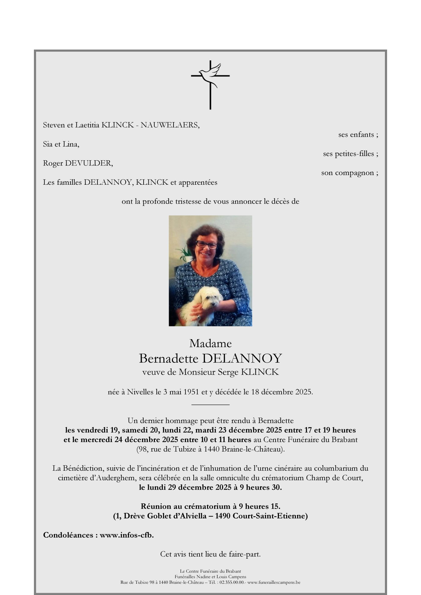Décédée à Nivelles (1400) le jeudi 18 décembre 2025 à l'âge de 74 ans