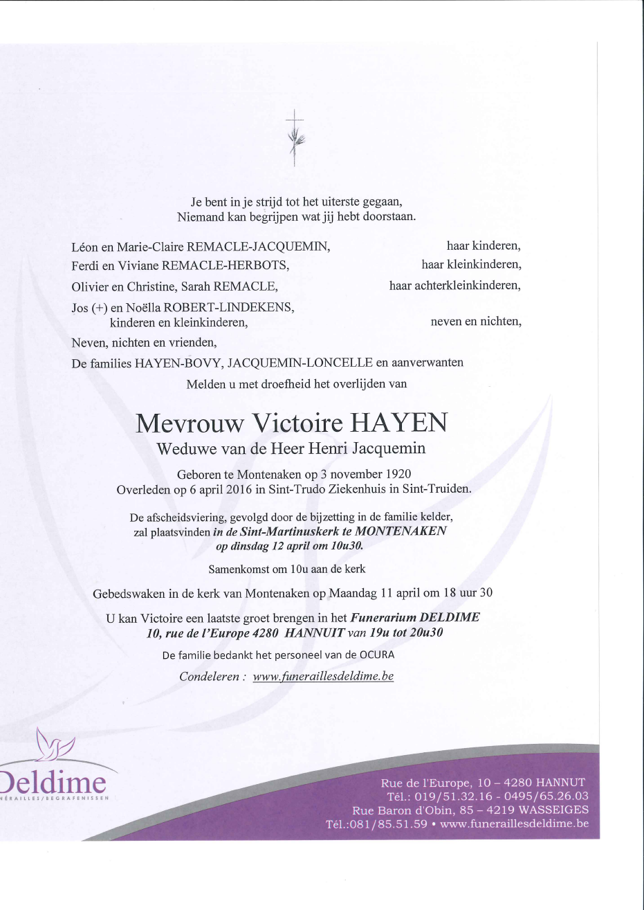 Died in Sint-Truiden (3800) on 06 April 2016 at the age of 95 years