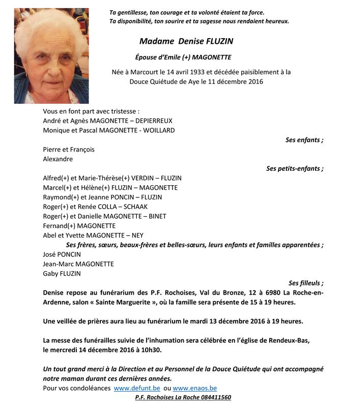 Décédée à Aye (6900) le dimanche 11 décembre 2016 à l'âge de 83 ans