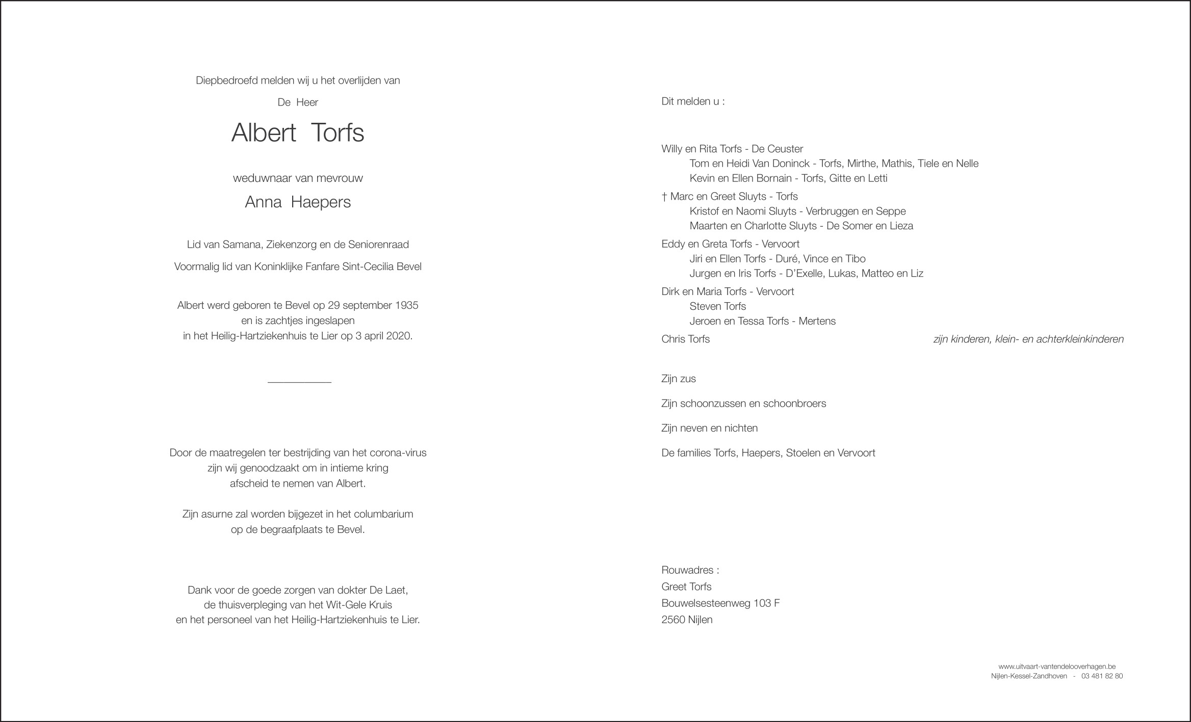 Overleden te Lier (2500) op vrijdag 3 april 2020 op 84-jarige leeftijd