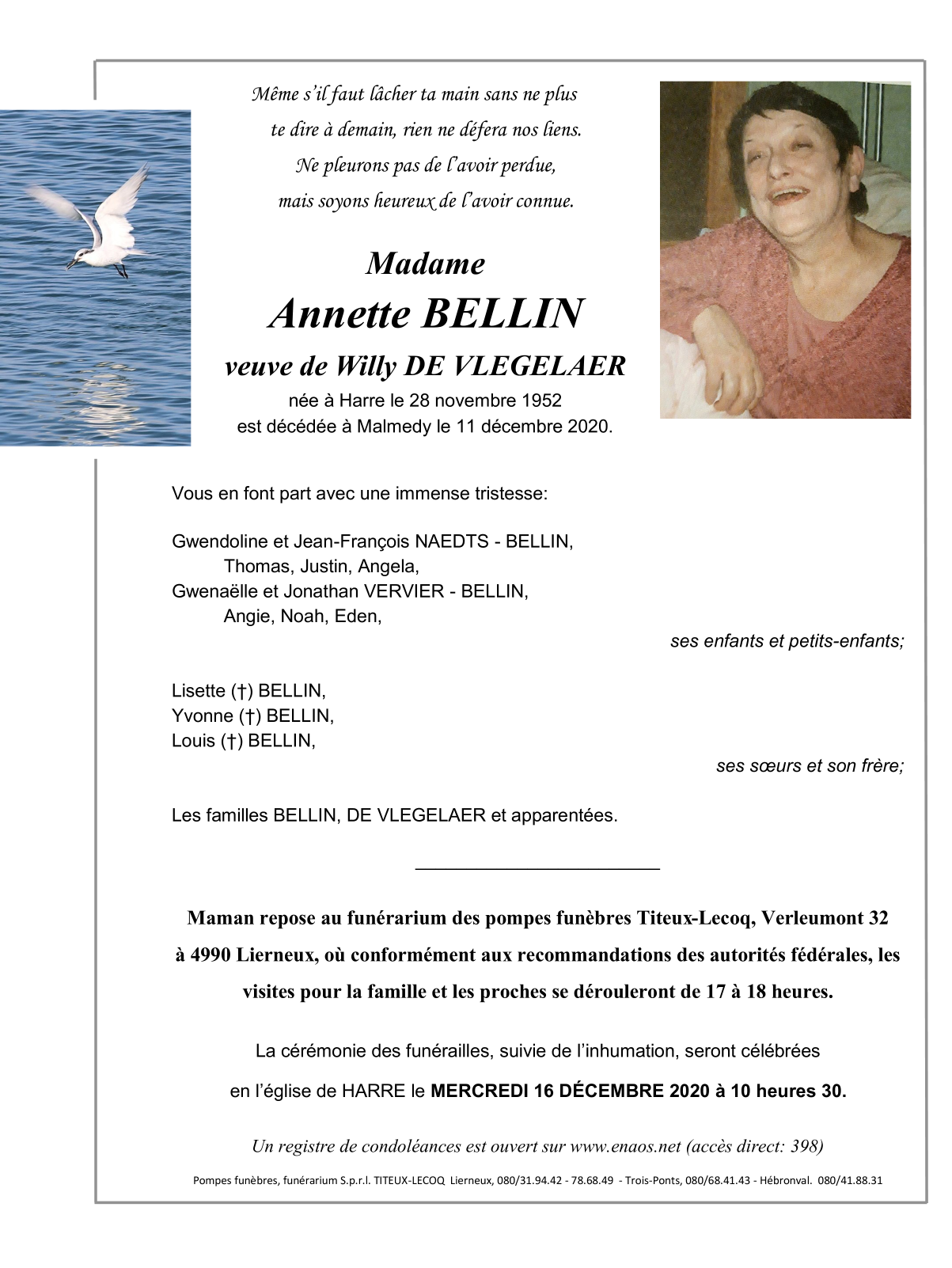 Décédée à Malmedy (4960) le vendredi 11 décembre 2020 à l'âge de 68 ans