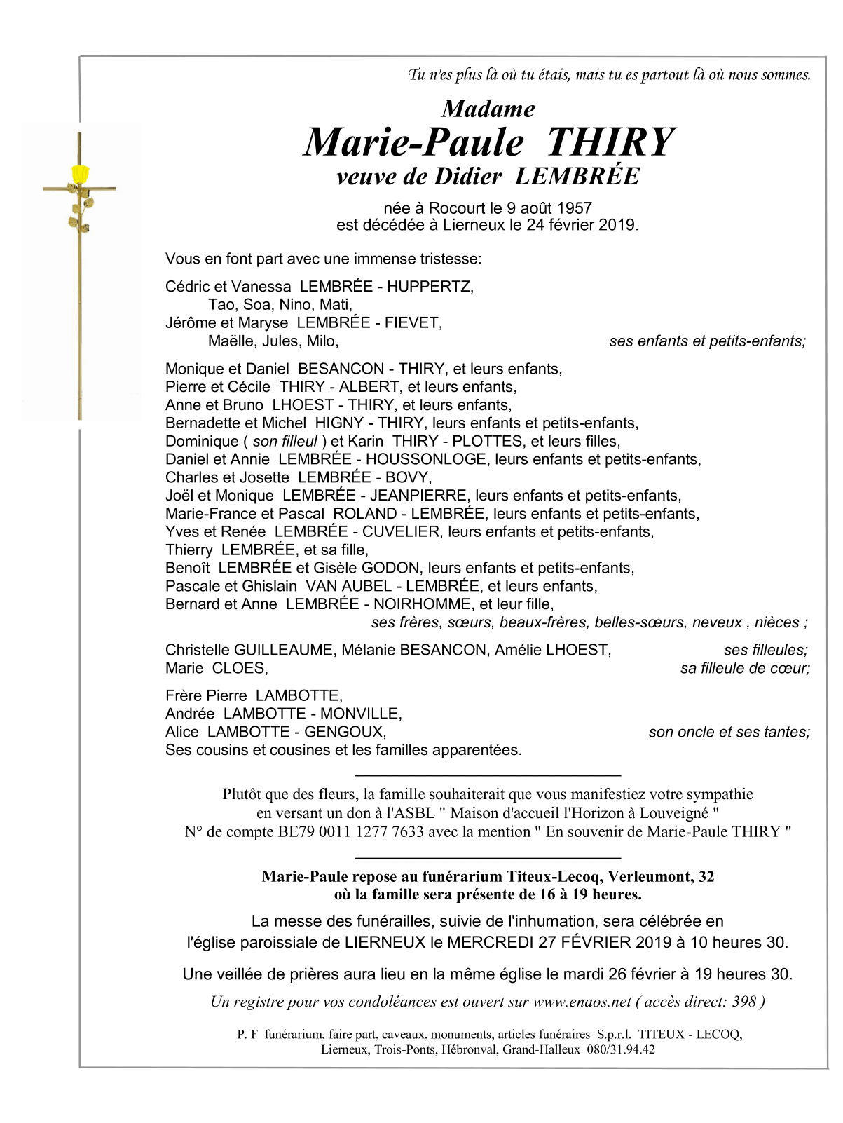 Died in Lierneux (4990) on 24 February 2019 at the age of 61 years