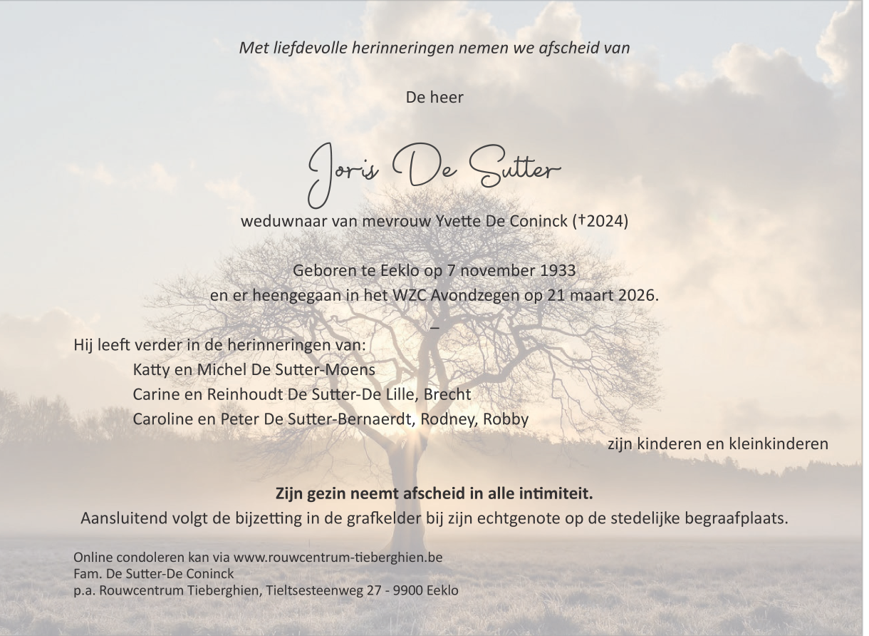 Overleden te Eeklo (9900) op zaterdag 21 maart 2026 op 92-jarige leeftijd