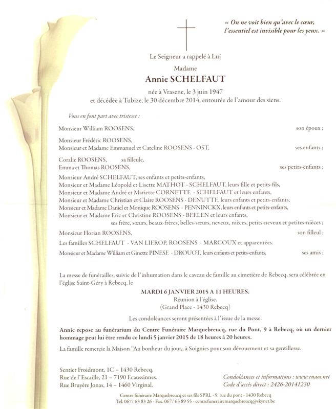 Décédée à Tubize (1480) le mardi 30 décembre 2014 à l'âge de 67 ans