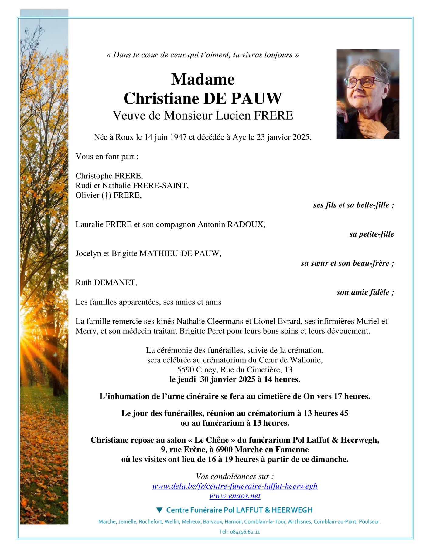 Overleden te Aye (6900) op donderdag 23 januari 2025 op 77-jarige leeftijd