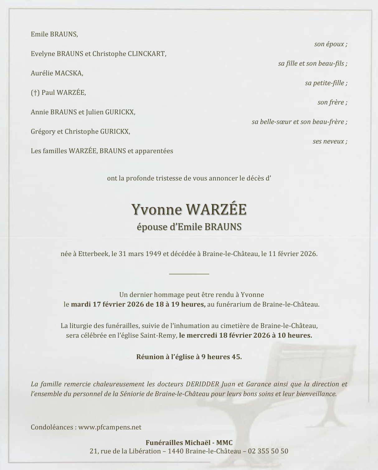 Fallecida en Braine-le-Château (1440) el miércoles, 11 de febrero de 2026 a la edad de 76 años