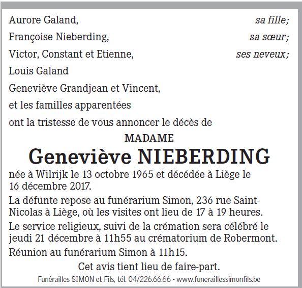 Overleden te Liège (4000) op zaterdag 16 december 2017 op 52-jarige leeftijd