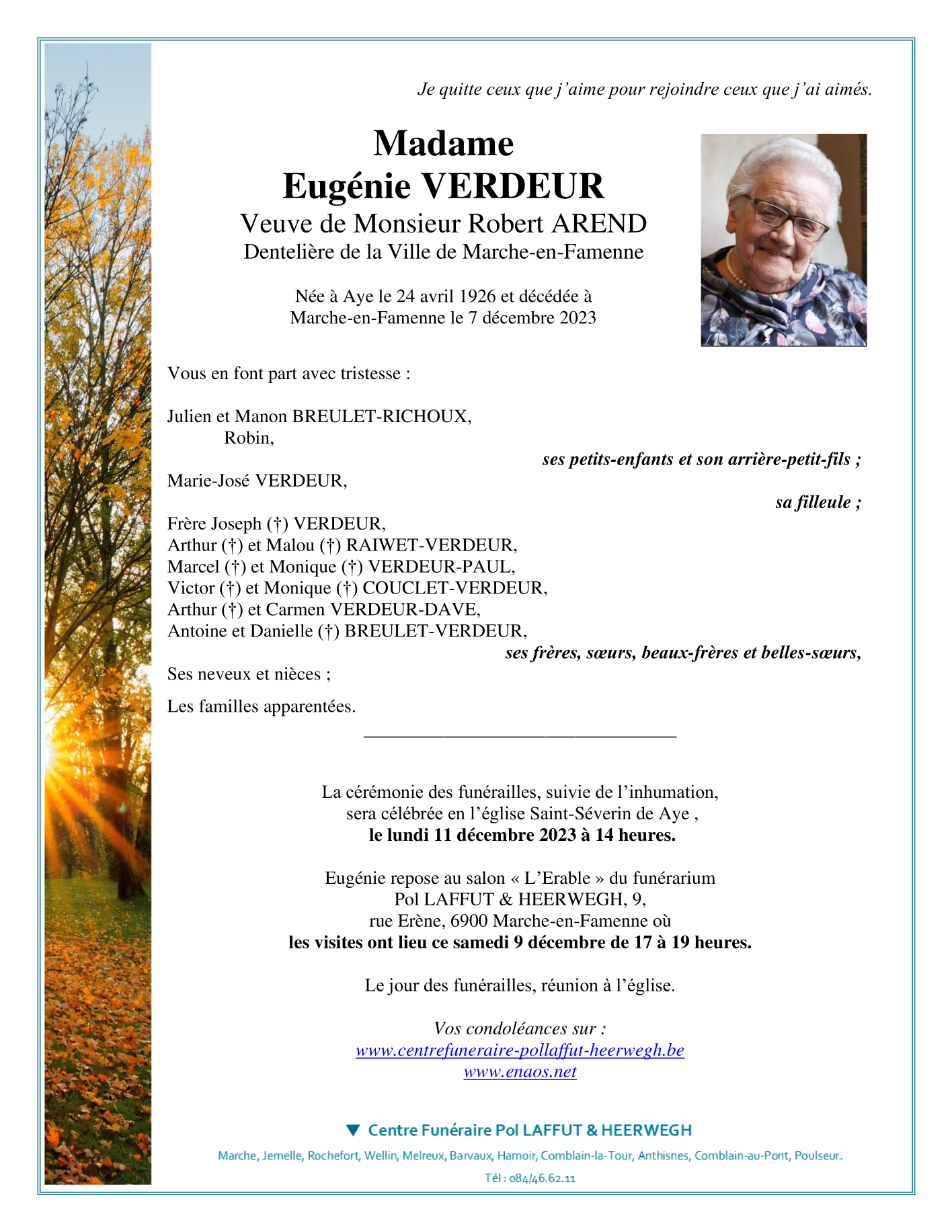 Died in Marche-en-Famenne (6900) on 07 December 2023 at the age of 97 years