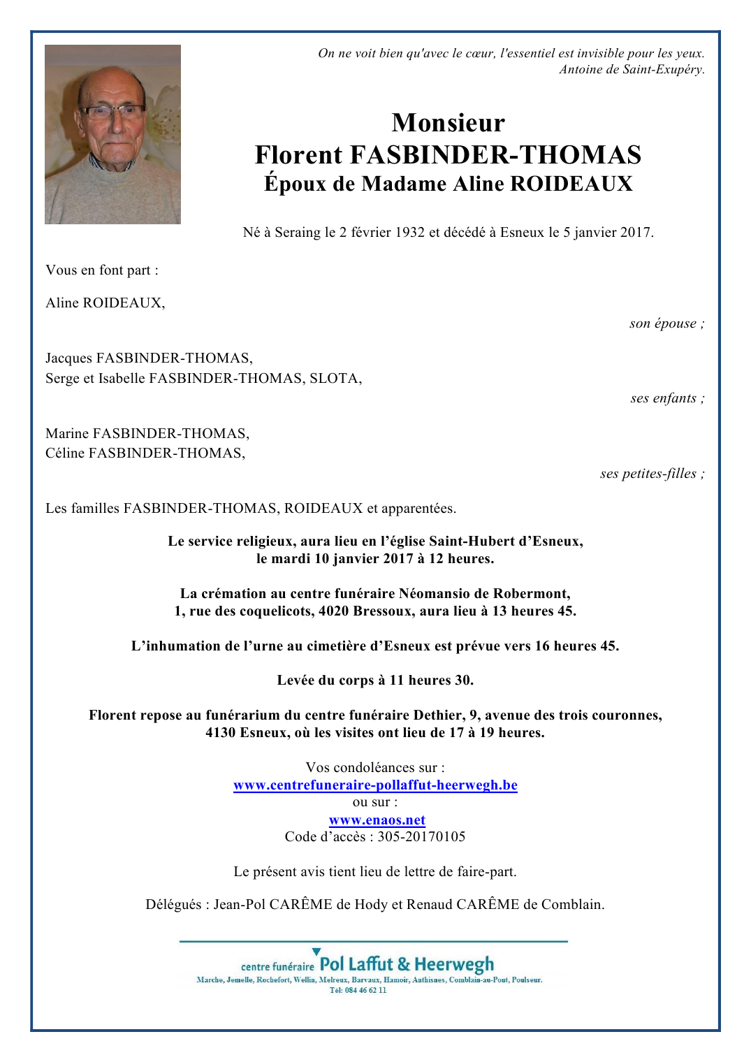 Décédé à Esneux (4130) le jeudi 5 janvier 2017 à l'âge de 84 ans