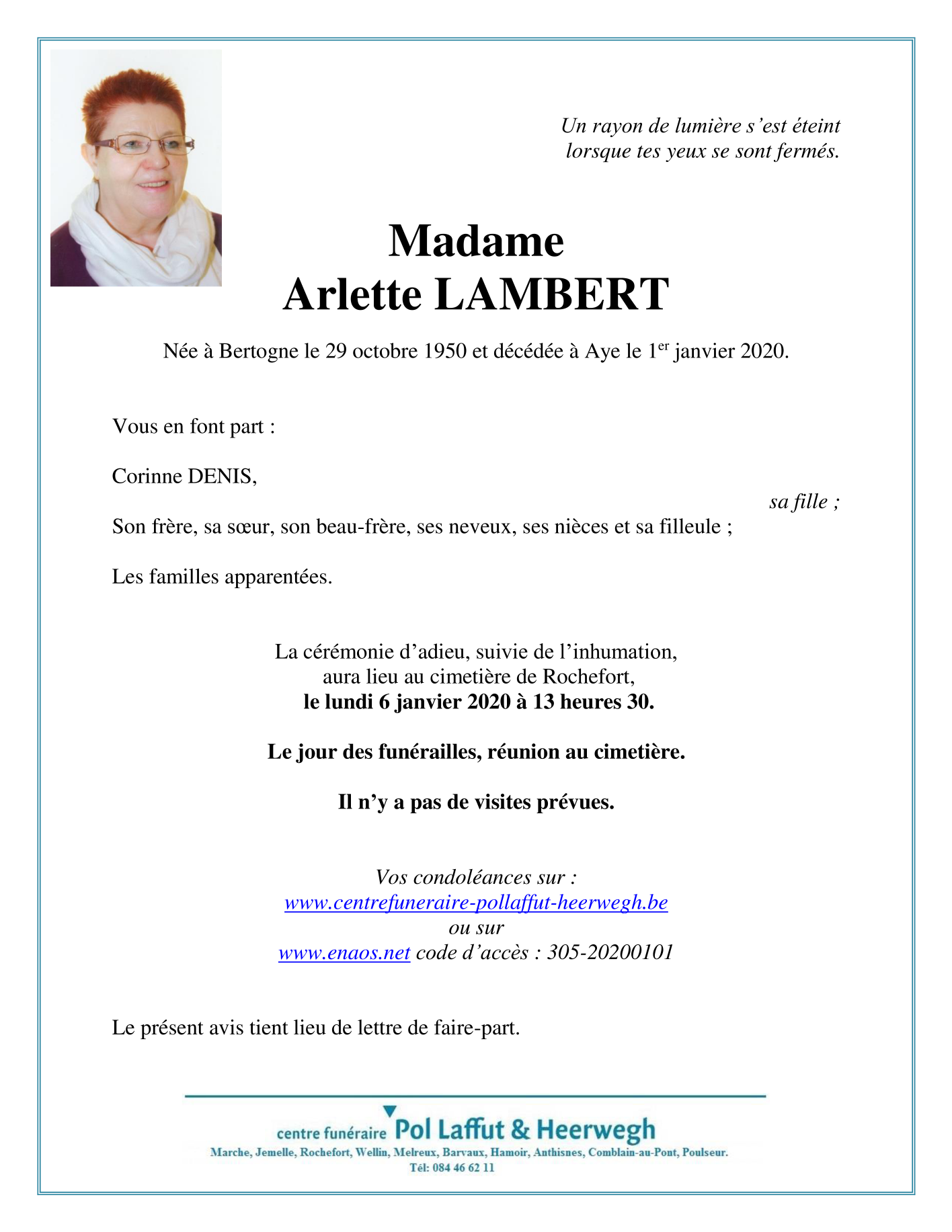 Décédée à Aye (6900) le mercredi 1 janvier 2020 à l'âge de 69 ans